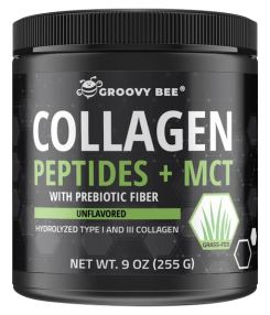 Groovy Bee® Collagen Peptides + MCT with Prebiotic Fiber contains hydrolyzed Type I and Type III collagen derived from grass-fed cows. Each 5 g serving of our premium powder blend contains 2.7 g of pure protein, making it a convenient way to get your daily intake of protein and beneficial amino acids.