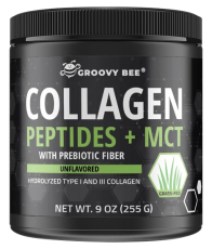 Groovy Bee® Collagen Peptides + MCT with Prebiotic Fiber combines the therapeutic properties of organic coconut MCT oil powder and lab-verified bovine collagen peptides to support healthy skin and hair. It is also packed with healthy fats, dietary fiber, and other nutrients that support a healthy cardiovascular system and digestive system. Our premium blend contains no gluten, artificial ingredients or synthetic chemicals. It is non-GMO and is lab tested for glyphosate, heavy metals and microbiology. Add Groovy Bee® Collagen Peptides + MCT with Prebiotic Fiber to your favorite smoothies, hot drinks, nutritional beverages, baked goods and other recipes to boost your overall health.